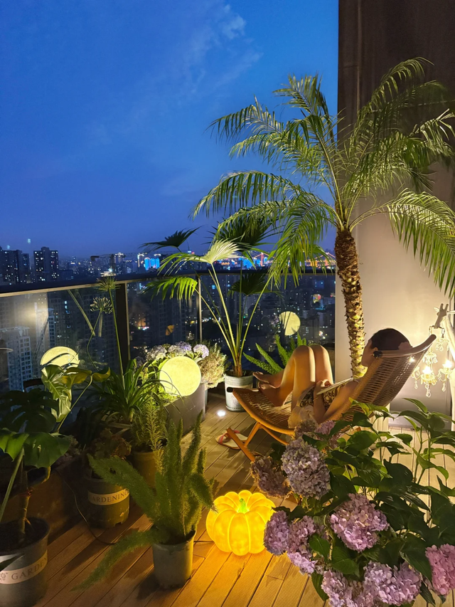 一张可折叠的小桌,几个软乎乎的抱枕,再加一串小灯串,傍晚坐在这儿喝杯咖啡,小小的幸福感就这么简单。